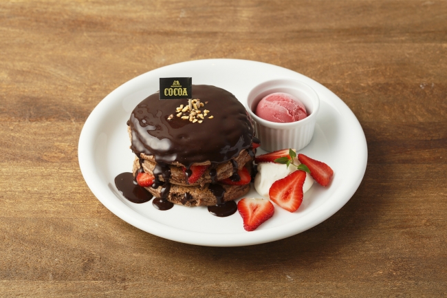 The pure cocoa pancake is another variety of pancake sold ー cocoa pancakes are layered with mascarpone cream and strawberries and finished off with Morinaga & Company’s pure cocoa sauce. The bitter chocolate combined with the strawberries makes a perfect match, creating a bittersweet flavour which adults may find particularly appealing.