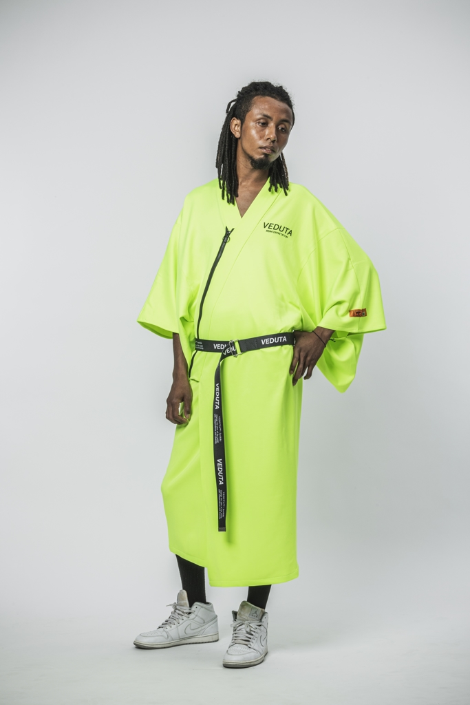 歴史的考察に裏付けられた日本人としてのアイデンティティーをもとに、ストリートのエッセンスを融合した唯一無二の世界を提案するブランド、「VEDUTA」。ジャージ素材の生地を用い、衿はジッパーでとめ、帯はベルト。簡単に着られて動きやすい、新しい和のスタイルを着こなすことができる。こちらのブランドは6月30日(水)からの取扱いスタート。